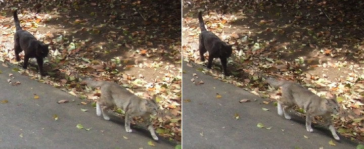 ・・が、黒猫が急に威嚇。茶猫びっくり!