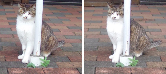 柱に笑い顔猫 交差法ステレオ立体視3D写真