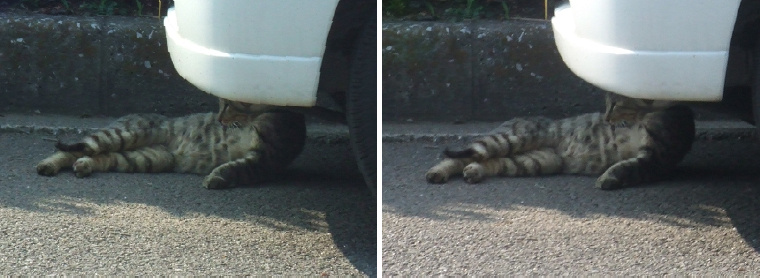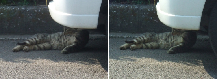 猫:「涼しそうな場所をみつけたぞ。どっこいしょっと・・」
