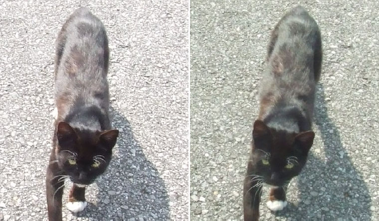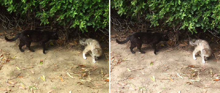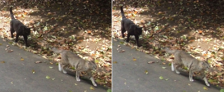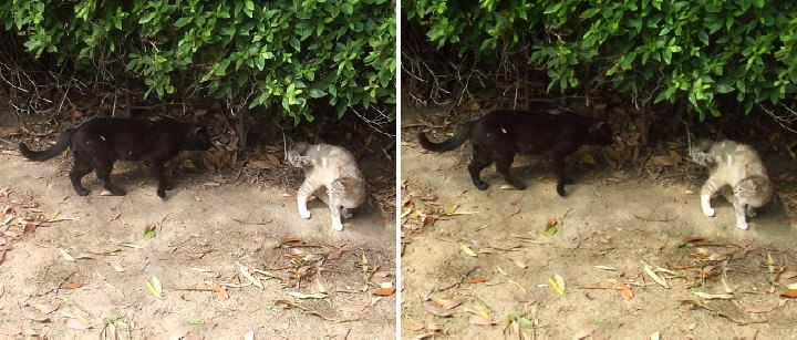 ・・が、黒猫が急に威嚇。茶猫びっくり!