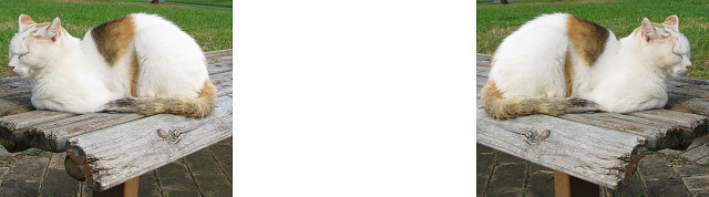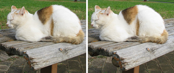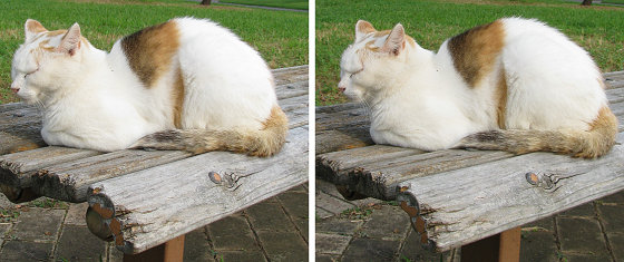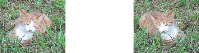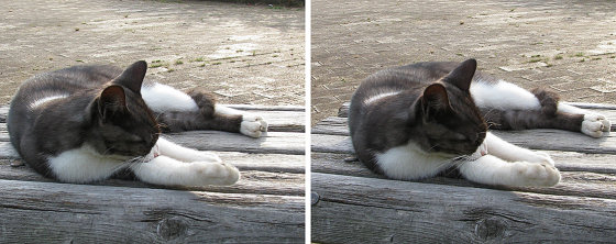 芝生を食べる猫 ミラー法3D立体ステレオ写真